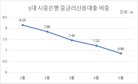 17일 은행연합회 공시에 따르면 지난 5월 5대 시중은행(KB국민·신한·하나·우리·NH농협)의 중금리 신용대출(연 7% 이상 10% 미만, 잔액기준) 평균 취급 비중은 6.86%로 나타났다. 지난 1월 8.16%를 기록한 이후 2월 7.86%, 3월 7.46%, 4월 7.22%로 꾸준히 감소했다.