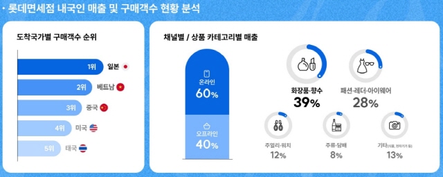 롯데면세점이 밝힌 6월 내국인 고객 데이터 분석에 따르면 해외여행 도착 국가별 구매 객수 1위는 일본이 차지했다. 구매 채널로는 온라인이 60%로 과반을 넘겼으며 상품 카테고리는 화장품·향수 부문이 39%로 1위를 기록했다. 실제 국토교통부 항공정보포털시스템에도 올해 6월 국가별 여객 수는 일본, 중국, 베트남, 미국, 대만 순으로 높아 롯데면세점과 유사한 기록을 보였다.