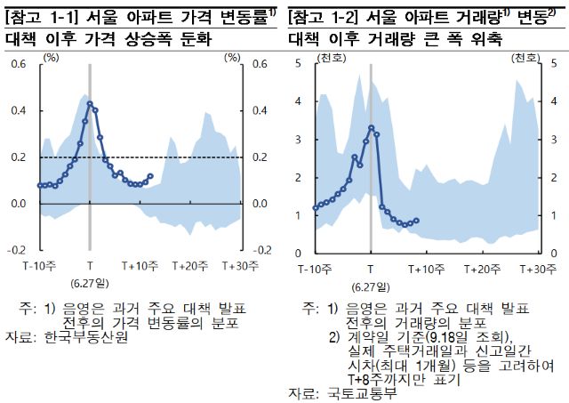 다만 6·27 대책 이후 서울 아파트 시장의 흐름을 과거 주요 대책 발표 시기와 비교해보면 거래량이 크게 위축됐으나 가격 상승폭의 둔화 정도는 제한적으로 나타났다.