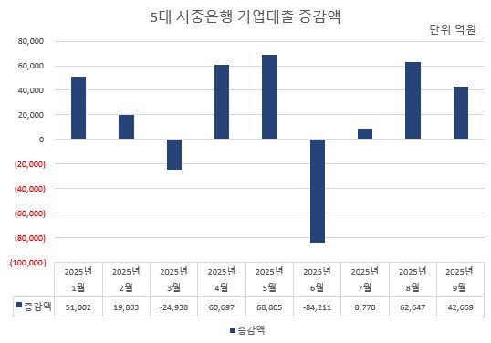 증가폭은 지난달 6조 2647억원을 기록한 이후 줄어들었다. 기업대출 증감액은 지난 6월 8조 4211억원 감소한 이후 7월 8770억원 증가 전환, 8월 6조 2467억원 늘었다.