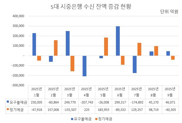 (서울=NSP통신) 강수인 기자 = 증시부양책으로 주식시장이 활성화되면서 주요 시중은행들의 정기예금 잔액이 4조원 이상 감소했다. 반면 투자대기금 성격의 요구불예금은 4조원 이상 증가했다.