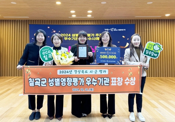 (경북=NSP통신) 김대원 기자 = 칠곡군은 지난달 31일 경상북도가 실시한 ‘2024년 성별영향평가 추진 우수기관상’을 수상했다.