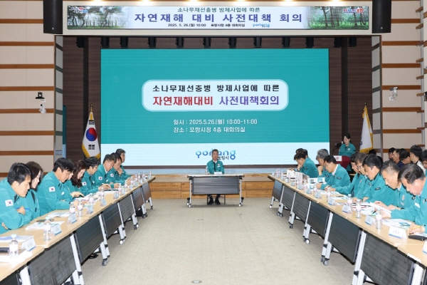 (경북=NSP통신) 조인호 기자 = 포항시는 26일 시청 대회의실에서 본격적인 우기와 태풍에 대비해 소나무재선충병 방제사업지의 재해 위험 요소를 점검하고 산림 지역의 안전을 확보하기 위한 선제 대응에 나섰다.
