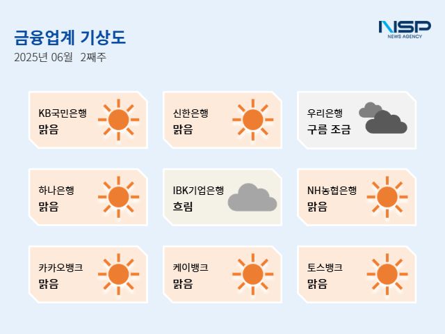 (서울=NSP통신) 강수인 기자 = 6월 2주차 금융업계 기상도는 KB국민은행·신한은행·하나은행·NH농협은행·카카오뱅크·케이뱅크·토스뱅크의 ‘맑음’, 우리은행의 ‘구름조금’, IBK기업은행의 ‘흐림’으로 기록됐다.