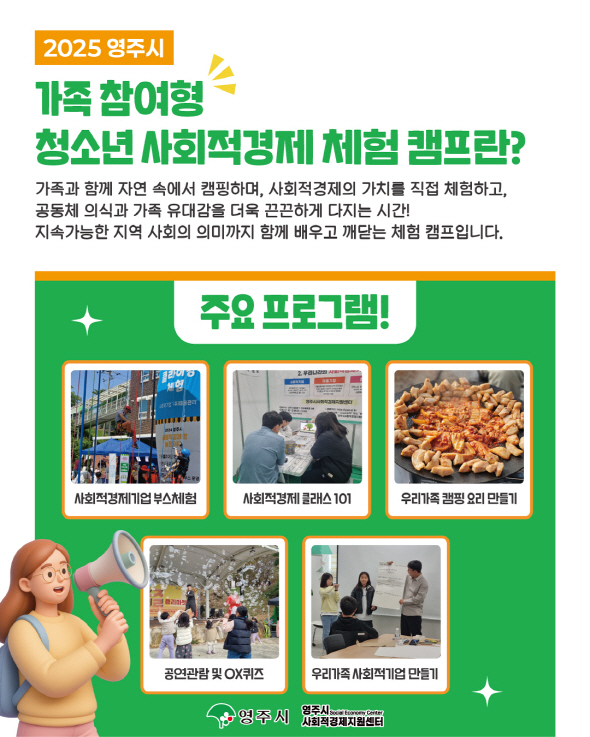 (경북=NSP통신) 김오현 기자 = 영주시는 영주시사회적경제지원센터와 함께 1일부터 오는 15일까지 ‘2025 가족참여형 청소년 사회적경제 체험 캠프’ 참가자를 모집한다.