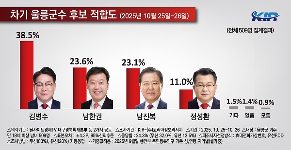 이번 조사는 영남이코노믹, 딜사이트경제TV 대구경북취재본부 공동으로 여론조사 기관 코리아정보리서치에 의뢰하여 10월25일부터 27일까지 3일간 울릉군 거주 만 18세 이상 남녀 509명을 대상으로, 무선전화 가상번호(80%)와 유선전화 RDD(20%)를 이용하여 자동 응답 방식으로 진행했다. 응답률은 무선전화 32.0%, 유선전화 12.5%이고, 표본오차는 95% 신뢰수준에 ±4.3%P다. 통계보정은 2025년 9월말 행정안전부 발표 주민등록 인구 기준 성, 연령, 지역별 셀가중값을 부여했다. 보다 자세한 내용은 중앙여론조사심의위원회 홈페이지를 참고하면 된다.
