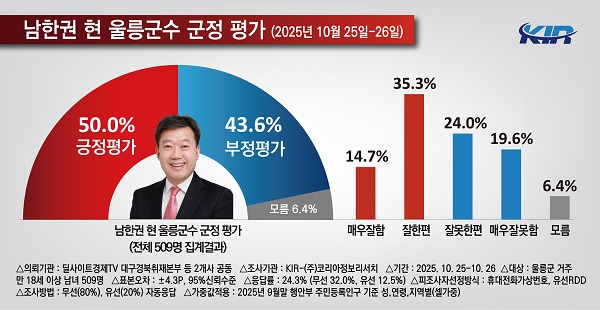 한편 남한권 현 울릉군수의 군정 평가 조사에서는 긍정 50.0%, 부정 43.6%로 나타났다.