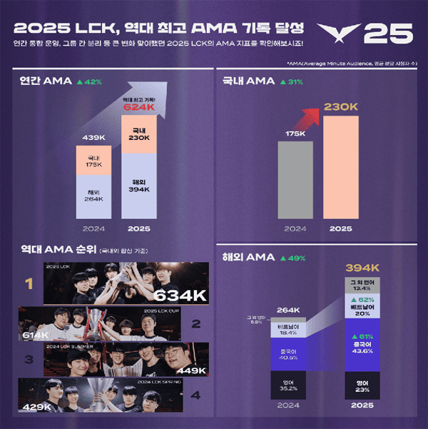 라이엇게임즈는 “2025년 리그 포맷 개편 후 LCK가 평균 분당 시청자 수와 국내 시청 지표, 글로벌 시청 지표에서 유의미한 성장을 달성했다고 밝혔다”라고 밝혔다.