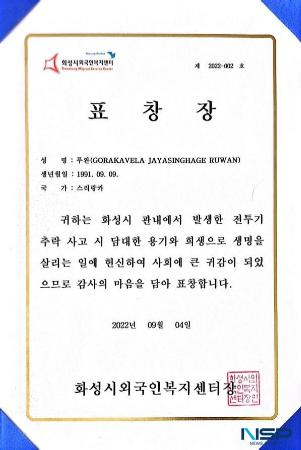 NSP통신-루완 씨가 지난 2022년 공군 전투기 조종사 2명을 구조하고 받은 표창장 (사진 = 한국스리랑카불교사원)