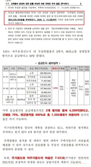 NSP통신-파주시 주택과가 발부한 과태료 처분 공문(위)과 LH가 배포한 보도자료(아래) (사진 = 가칭)파주 힐스테이트 더 운정 수분양자 비대위, NSP통신)