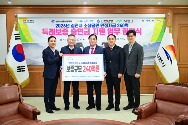 (경북=NSP통신) 김대원 기자 = 김천시(시장 배낙호)는 관내 소상공인 경영 안정자금 지원을 위해 경북신용보증재단, NH농협은행, 신한은행, iM뱅크(139130)와 협약을 맺고 총 240억 원 규모의 소상공인 특례 보증 지원에 나선다고 9일 밝혔다.