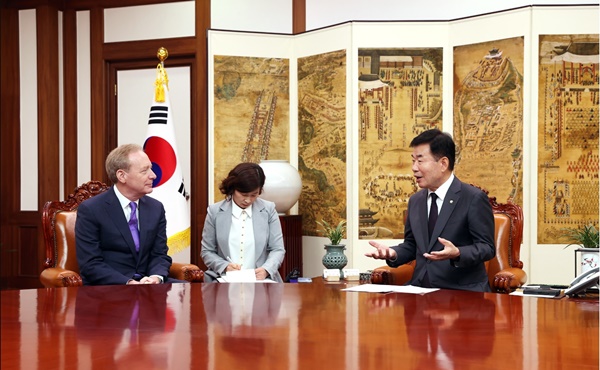 김 의장은 접견에서 “한국은 인공지능 기술 후발주자로서 민간 및 공공부문에 인공지능 기술을 접목해 확산시키는 것에 관심이 많다”며 “인공지능 기술을 선도하고 있는 마이크로소프트의 폭넓은 경험과 의견을 공유해주길 바란다”고 당부했다.