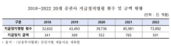 지난 24일 국회 정무위원회 소속 국민의힘 최승재 의원이 금융투자협회를 통해 자산총계 상위 20개 증권사로부터 제출받은 자료에 따르면 2018년 3만 2000건 수준이던 지급정지 명령 횟수가 2022년에는 7만3000건으로 두 배 이상 증가했한 것으로 집계됐다.