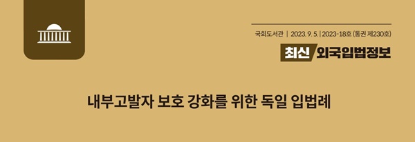 (서울=NSP통신) 강은태 기자 = 국회도서관(관장 이명우)은 5일‘내부고발자 보호 강화를 위한 독일 입법례’를 소개한 ‘최신외국입법정보(2023-18호, 통권 제230호)’를 발간했다.