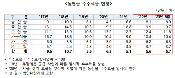 이를 구체적으로 살펴보면, 농산물 수수료는 8.9%, 축산물은 9.7%, 수산물은 11.8%다. 이는 가전이나 생필품의 수수료가 각각 6.3%, 3.7%와 비교해보면 2∼3배 높은 수준이다.