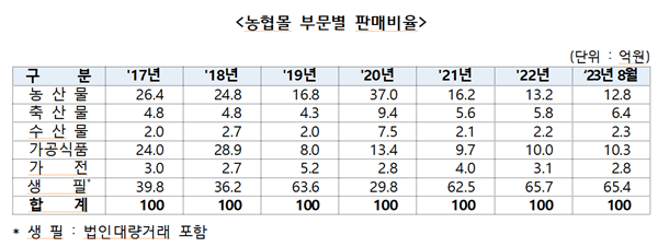 올해 8월 현재, 농산물 판매 비율은 12.8%, 축산물 6.4%, 수산물 2.3%에 불과하고, 가공식품은 10.3%, 생필품은 무러 65.4%에 이른다.