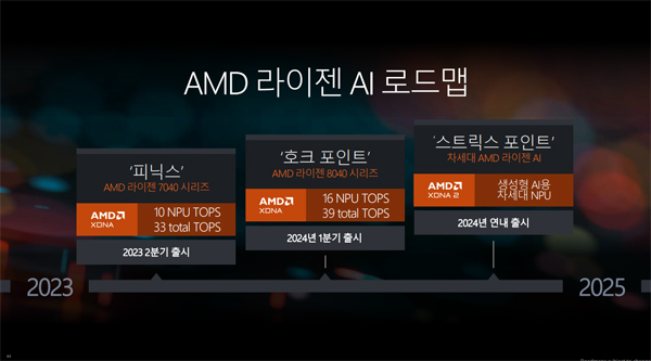 이외 AMD는 일반 소비자용 AI PC를 위한 최신 라이젠 프로세서 제품군을 소개했다. AMD 라이젠 AI 로드맵을 공개했는데, 이중 생성형 AI용, 차세대 NPU는 연내 출시를 목표로 하고 있다.