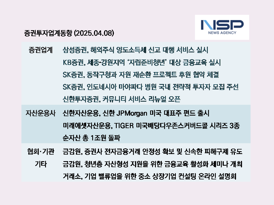 (서울=NSP통신) 설희 기자 = 지난달 18일 한국거래소 전산장애가 발생해 코스피 시장이 멈췄다. 지난 3일, 4일에는 이틀 연속으로 키움증권에서 전산오류가 발생했다. 이에 이복현 금감원 원장은 증권사 전자금융거래 안정성 확보와 신속한 피해구제 유도를 강조했다. 금감원은 청년층 자산형성 지원을 위한 금융교육 활성화 세미나를 개최했다. 신한자산운용과 미래에셋자산운용이 미국 시장 관련 상장지수펀드(ETF)를 주력 상품으로 내세웠다. 이 가운데 신한자산운용은 신한 JP Morgan 미국 대표주 펀드를 출시했고, 미래에셋자산운용의 TIGER 미국배당다우존스커버드콜 상장지수펀드(ETF) 3종의 순자산 총합이 1조원을 돌파했다. 삼성증권은 2024년 귀속 해외주식 양도소득세 신고 대행 서비스를 시행한다.