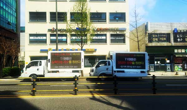 이같은 의견을 담아 트럭에는 “T1팬들은 실력 있는 선수를 원한다”, “T1팬들은 정당한 경쟁을 원한다”라는 메시지를 담아 항의에 나섰다.