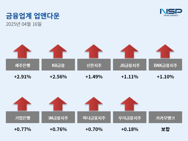 JB금융지주는 전거래일 대비 1.11%(190원) 올라 1만7260원으로 장을 마쳤고 BNK금융지주는 전거래일 대비 1.10%(110원) 상승해 1만80원으로 장을 마감했다.