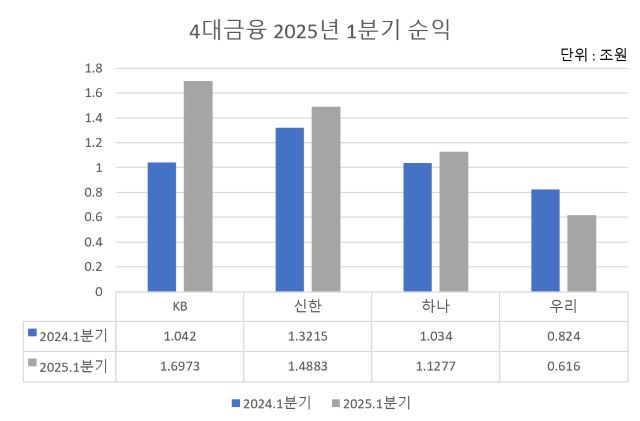 28일 KB금융(105560), 신한금융(055550), 하나금융, 우리금융지주에 따르면 올해 1분기 4대 금융지주는 4조 9293억원의 당기순이익을 시현했다. 지난해 1분기 4조 2215억원의 당기순이익을 거둔 후 14.36% 증가해 사상 최고 기록을 세웠다. 지난해 홍콩 H지수 주가연계증권(ELS) 손해배상 비용 등 일회성 비용 요인이 사라진 영향이다.
