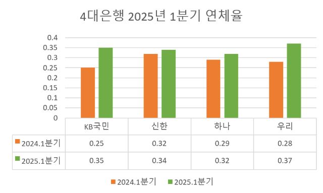계열사 은행의 연체율도 상승하고 있다. 4대 시중은행(KB국민·신한·하나·우리은행)의 1분기 평균 연체율은 0.35%로 전년 대비 0.06%p 상승했다. KB국민은행의 경우 1분기 연체율은 0.35%로 1년새 0.10%p 증가했다. 우리은행도 0.37%로 전년 대비 0.09%p 늘었다.