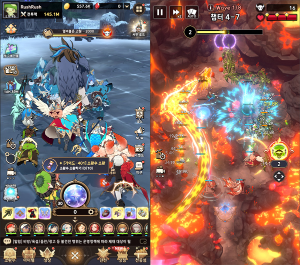 물론 방치형 모드에서도 다른 키우기 게임과 차별화된 콘텐츠를 제공하기 위해 노력했다. 소환수 수집의 재미 외에도 마법 구슬을 통한 장비 강화를 비롯해 다양한 성장 루트를 마련했으며, 천공섬 보스전 같은 PvE 콘텐츠부터 결투장 등의 PvP 요소도 다채롭게 구성돼 있다.