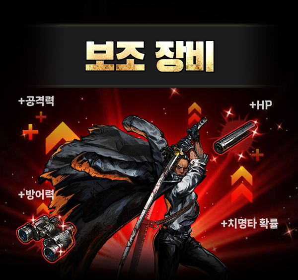 캐릭터에 보조 장비를 장착해 능력치를 향상시킬 수 있다. 처음으로 선보이는 보조 장비는 야간 투시경과 소음기 총 2종이다.