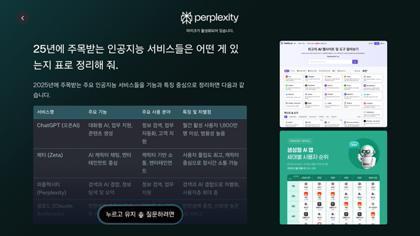 퍼플렉시티는 AI 기반 검색 엔진으로, 신뢰 가능한 출처에서 정보를 수집·분석해 심층 답변과 추가 질문을 제공한다. 영화 추천, 여행 계획, 스포츠 결과, 기업 실적 분석 등 다양한 주제의 질문에 맞춤형 답변이 가능하다.
