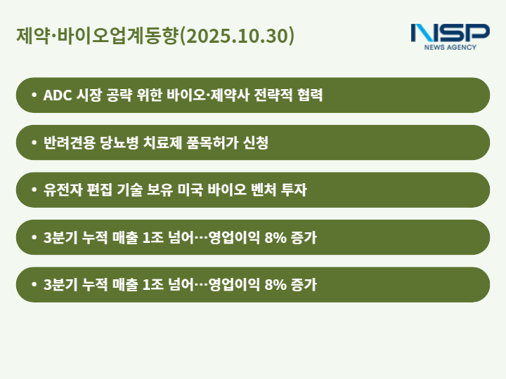 (서울=NSP통신) 정송이 기자 = 제약·바이오업계가 신약 실적 개선과 글로벌 협력 강화로 성장세를 이어가고 있다. 국내 신약의 해외 기술이전 성과와 차세대 바이오의약품 개발 협력이 가시화되는 한편 반려동물 치료제 등 신규 시장 개척도 활발히 진행되고 있다.