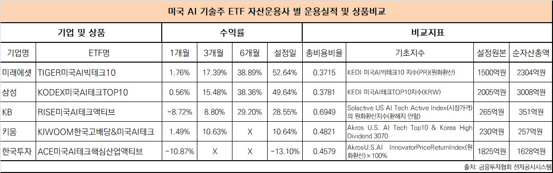 가장 높은 성과를 거둔 곳은 미래에셋자산운용과 삼성자산운용이다. 양 사는 각각 지난해 8월과 6월 미국 AI 기술주 ETF를 시장에 출시해 우수한 성적을 냈다.