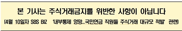 SBS BIZ는 10일자 ‘내부통제 엉망...국민연금 직원들 주식거래 대규모 적발’ 제하의 기사에서 “국민연금 기금운용본부 임직원들이 내부 규정을 위반하고 대규모 주식 거래를 한 사실이 확인됐다”고 보도했다.