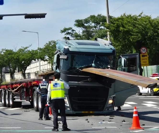 추돌로 인해 트레일러에 적재된 철판 일부가 트레일러 차량 앞부분을 뚫고 나왔다.