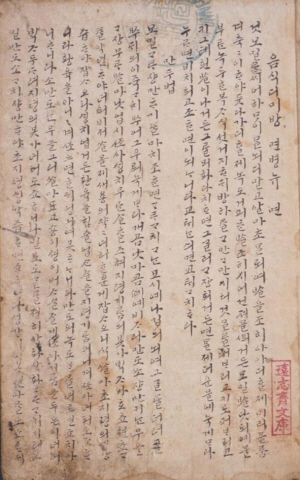 음식디미방(장계향, 1670년대)은 재령 이씨 석계 이시명의 부인인 장계향이 쓴 현존하는 가장 오래된 순한글 조리서다. 146개 항목의 조리법을 담고 있으며 면병류, 어육류, 주국방문(주류), 식초 담그는 법 등 4개 영역으로 나누어져 있는 것이 특징이다.