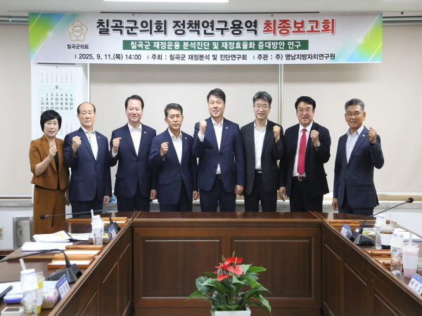 (경북=NSP통신) 김대원 기자 = 칠곡군의회는 오용만 대표 의원을 비롯한 6명의 의원으로 구성된 칠곡군 재정분석 및 진단연구회가 지난 11일 칠곡군 재정운용 분석진단 및 재정효율화 증대방안에 대한 연구용역 최종 보고회를 개최했다고 밝혔다.