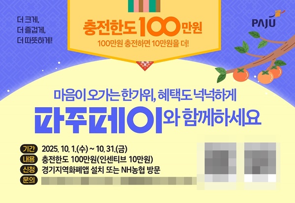 (서울=NSP통신) 강은태 기자 = 파주시가 오는 10월 한 달간 시민의 생활비 부담을 줄이고 지역경제에 활력을 불어넣기 위해 파주페이 충전 한도를 최대 100만 원까지 상향한다.