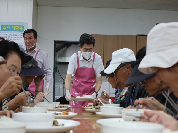 NSP통신-이강덕 포항시장이 2일 추석을 앞두고 무료급식소 만나의집을 방문해 어르신 200여 명에게 배식 봉사를 하며 감사의 마음을 전했다. (사진 = 포항시)