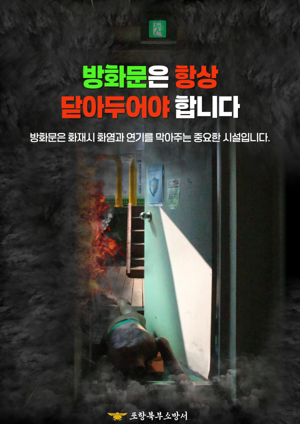 포항북부소방서는 최근 화재 발생 시 인명피해 최소화를 위해 공동주택 입주민과 관리자를 대상으로 방화문 닫기를 적극 실천해 줄 것을 강조하고 있다. (사진 = 포항북부소방서)
