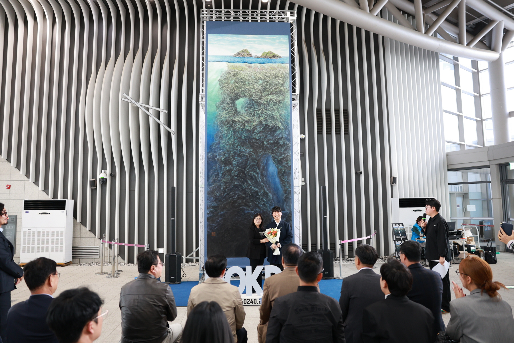 (경북=NSP통신) 김민정 기자 = (사)독도사랑운동본부(총재 노상섭)는 지난 24일 독도의 날을 앞두고 서울 SRT 수서역에서 한국화가 서준범 작가와 함께 6m 대형한지 위에 독도 바닷 속 심연 2268m를 형상화한 수묵채색화 ‘Secret Dokdo 2268’을 제막식을 통해 공개했다.