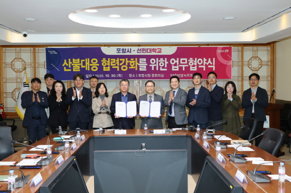 (경북=NSP통신) 조인호 기자 = 포항시는 30일 시청 중회의실에서 선린대학교와 산불 감시·예방 전문인력 양성 및 드론 기반 산불 대응체계 구축을 위한 업무협약을 체결했다.