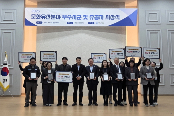(경북=NSP통신) 조인호 기자 = 경상북도는 22일 안동 그랜드호텔에서 문화유산 보존과 활용 분야에서 탁월한 성과를 거둔 7개 시군을 선정해 ‘2025년 문화유산 분야 우수 시군’ 시상식을 개최하고 그간의 노고를 격려했다.