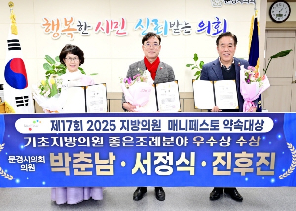 (경북=NSP통신) 김대원 기자 = 문경시의회 진후진, 박춘남, 서정식 의원이 ‘제17회 2025 지방의원 매니페스토 약속대상'에서 좋은 조례 분야 우수상을 수상했다.