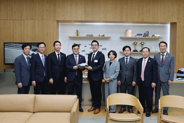 우원식 의장이 현대자동차혁신센터 시찰을 마치고 기념촬영을 하고 있다. 좌측부터 이항수 현대차그룹 부사장, 송재봉 의원, 이정헌 의원, 박현성 현대차그룹 전무, 서미화 의원, 김현정 의원, 한기호 의원, 서일준 의원. (사진 = 국회의장 공보수석실)