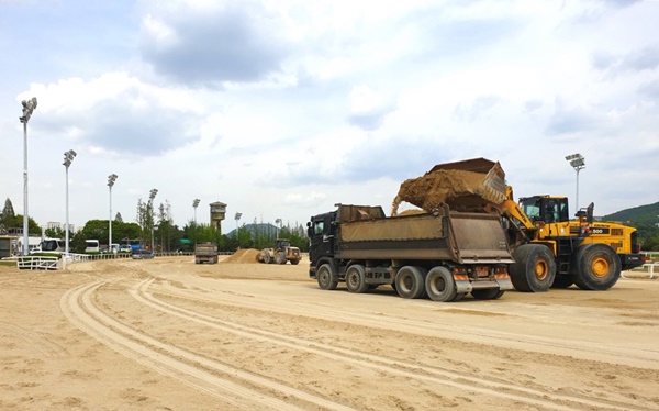 (서울=NSP통신) 강은태 기자 = 한국마사회(회장 정기환)는 지난 24일과 25일 렛츠런파크 서울 경주로에서 40여 대의 중장비들을 동원해 4000톤에 달하는 모래를 퍼 나르며 경주로 모래교체 작업이 진행됐다.