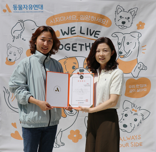 기부금 전달식은 지난 5월 23일 경기도 남양주시에 위치한 동물자유연대 온 센터에서 LF 헤지스사업부 윤정희 전무와 관계자, 동물자유연대 온 센터 윤정임 센터장이 참석했다.