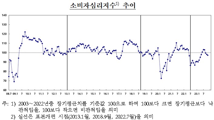 CCSI는 소비자동향지수(CSI) 중 6개 주요지수를 이용해 산출한 심리지표다. 소비자들의 경제상황에 대한 심리를 종합적으로 나타낸다. 장기평균치(2003년 1월~2022년 12월)를 기준값으로 100보다 크면 낙관적, 작으면 비관적임을 의미한다.