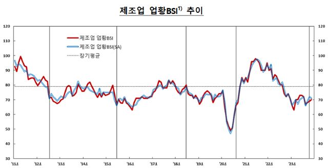 BSI는 현재 경영 상황에 대한 기업들의 판단과 전망을 지수화한 통계다. 긍정 응답이 우세하면 지수가 100을 넘고 부정 응답이 우세하면 100 이하로 떨어진다.