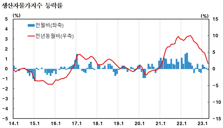 농림수산품은 수산물이 2.3% 올랐으나 농산물이 5.5% 내려 전월 대비 0.8% 하락했다. 공산품은 컴퓨터·전자 및 광학기기가 0.6% 내렸으나 제1차금속제품이 0.6% 올라 전월 대비 0.2% 상승했다. 전력·가스·수도 및 폐기물은 산업용도시가스가 20.8% 크게 하락해 전월 대비 2.8% 하락했다. 서비스는 음식점 및 숙박서비스 0.8%, 금융 및 보험서비스 0.8% 올라 전월 대비 0.3% 상승했다.