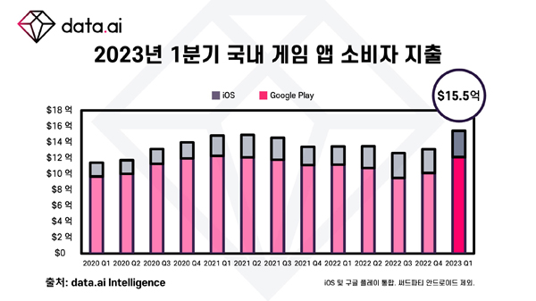 data.ai의 분석에 의하면, 국내 모바일 게이머들은 올해 1분기 게임 앱에 15.5억 달러(한화 약 2조 원)를 소비하고, 1.4억 건을 다운로드했다.