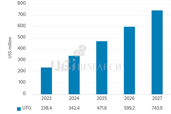 UTG 시장은 2023년 2.4억 달러에서 2027년 7.4억 달러까지 성장할 것으로 전망되며, colorless PI 시장은 2023년 1.7억달러에서 2027년 9500만 달러까지 축소될 것으로 전망된다.